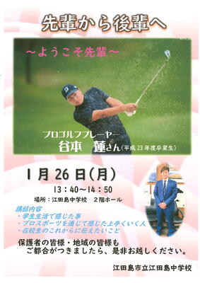 プロゴルファー 谷本連様をお迎えし、先輩から後輩へ講話をしていただきます。