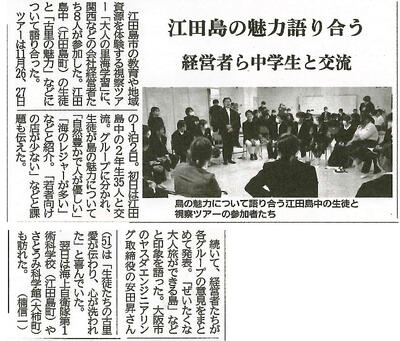 11月26日(水)、午後から、関東・関西・四国の企業の経営者の皆さん14名が来校されました。今回の研修では江田島市を選ばれ、本校にも視察を兼ねて訪問されました。経営者の皆さんは、2年生から江田島市の紹介などを聞いたり、生徒へのアドバイスを送ったりされ、学びを深められました。研修は、10グループ(経営者1名+生徒3~4名)に分かれてすすめられました。