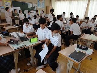 本日は、全校登校日で平和学習を行いました。講師は、県立高校の元校長先生で、被爆者の家族が親や祖父母らの体験を伝える「家族伝承者」である細川 洋先生でした。先生からは、広島の歴史、原爆の恐ろしさ(熱、爆風、放射線)、爆心地近くで被爆しながらも奇跡的に一命を取り留めたお父様のこと、叔母様の森脇瑤子さんのこと(日記の紹介、第一 県女在学中に被爆)などについて、心を込めて、丁寧に、中学生にもわかりやすくご講演いただきました。先生の醸し出すあたたかい人柄から、生徒も熱心に聞き入っていました。本日は、平和の尊さについて本当によい学習をさせていただきました。ありがとうございました。