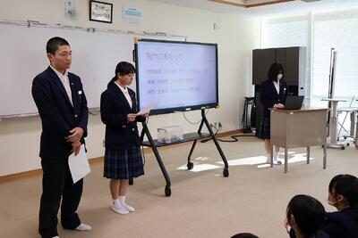 教頭先生からのお話の後、生徒会執行部から学級旗制作についての説明がありました。昨年度の旗のデザインをテレビに映したり、制作期間を伝えたりして、学級旗制作へのモチベーションを高めていました。