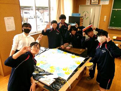 1年生はオレンジや赤を利用して燃え上がる炎を描いていました。2年生は、黄色や水色でクラスメイトの手形を押す作業を行っていました。3年生は黒色で筆を進めていました。果たして何が完成するのでしょうか....? とっても楽しみです!!学級旗デザインは各クラスで数々候補がある中、選ばれた作品です。その作品をグラデーションや色遣い、筆の置き方・塗り方を工夫して制作する姿に、強い氣迫を感じました。一つの作品にかける思いはみんなに届きます、きっと。
