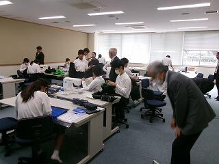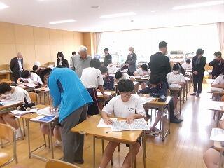 江田島市教育委員会の教育長ミーティングが行われ、本校に県教育委員会、市教育委員会の皆様方が10名ご来校くださいました。はじめに全学級の授業を参観され、その後の協議では、今後の授業の在り方や生徒の頑張りについて具体的に評価をいただきました。