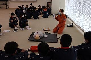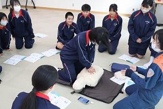 2月6日(金)の保健の授業で、2年生が救命救急の講習を受けました。江田島消防署の方に救急の必要性、心臓マッサージの手順等、丁寧に指導していただきました。